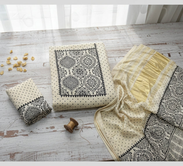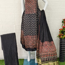 “Crafted using traditional Ajrakh hand block printing, each suit is printed by skilled Kutch artisans. Made with natural dyes and pure modal silk it offers a soft feel, premium fall, and long-lasting colour.”