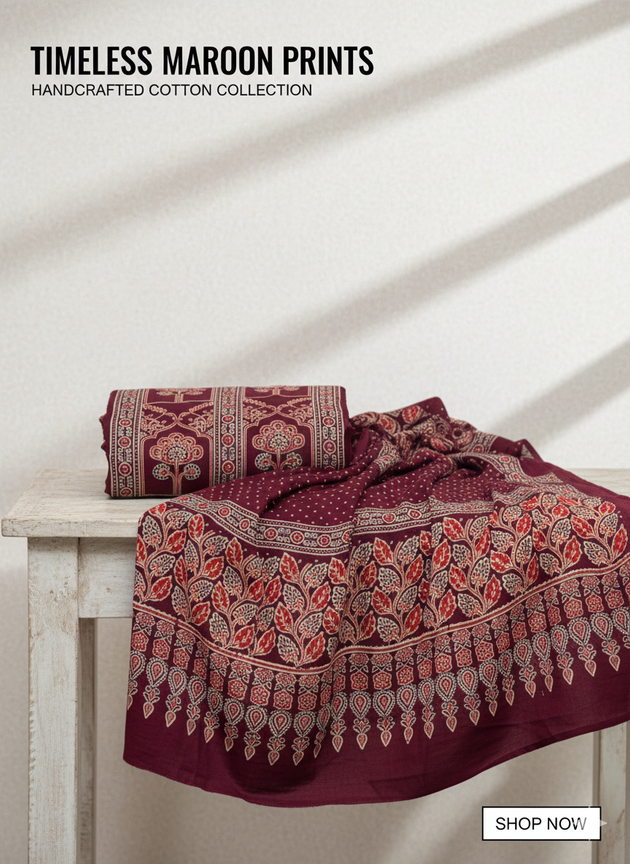 “Crafted with natural And Neptol dyes and traditional hand block printing, our Ajrakh collection offers timeless designs with a premium finish.”