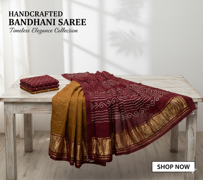 Discover the elegance of handcrafted Bandhani sarees made with traditional tie & dye techniques. Rich colours, premium fabric, and timeless patterns perfect for festive and dail