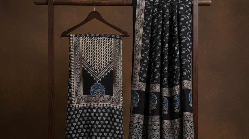 Explore our newest Ajrakh sarees, suits, and dupattas crafted with natural and neptol dyes and premium fabrics. Discover unique designs that blend tradition with modern style.”