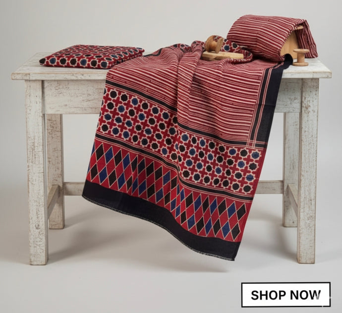 xperience the beauty of traditional Ajrakh art crafted with natural and neptol dyes and premium-quality fabrics.